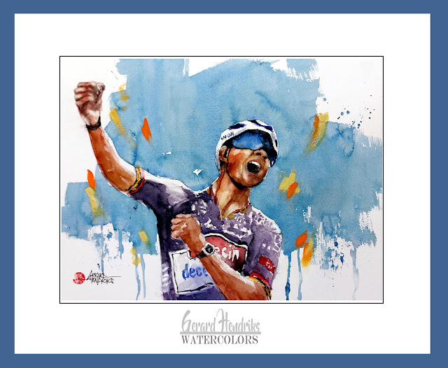 Dat moment van pure euforie leent zich perfect voor een expressieve aquarel: denk aan die opgetrokken armen, de emotie in zijn gezicht, het contrast tussen fysieke inspanning en mentale triomf.